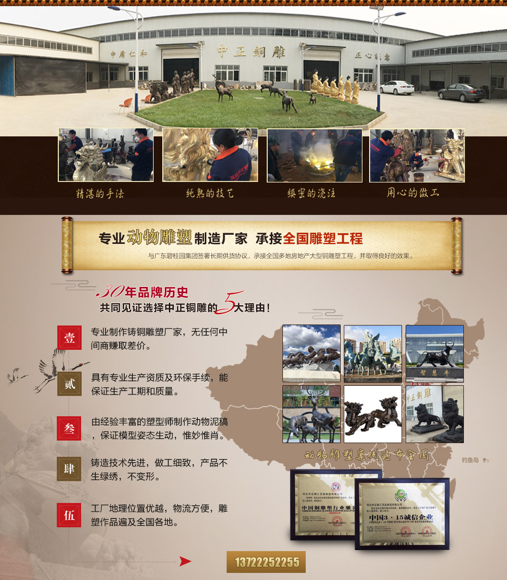 河北中正鑄銅工藝品制造有限公司是一家專業(yè)制作鑄銅動(dòng)物雕塑的生產(chǎn)廠家。擁有完善、大型、先進(jìn)的鑄造生產(chǎn)設(shè)備,并由數(shù)位經(jīng)驗(yàn)豐富的高級(jí)鑄造技師指導(dǎo)生產(chǎn)及制作。我們公司主要鑄造動(dòng)物銅雕、銅獅子、銅麒麟、銅牛、銅馬、銅鹿、銅大象等,可按客戶提供動(dòng)物銅雕圖片訂做、加工動(dòng)物銅雕,動(dòng)物銅雕塑,我們的產(chǎn)品做工精美,造型生動(dòng),用銅扎實(shí),質(zhì)量有保證。